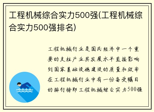 工程机械行业是国民经济中一个重要的支柱产业,其发展水平直接影响到国家基础设施建设的质量和效率。在工程机械行业中,有一份备受瞩目的排行榜,即工程机械综合实力500强排名。该排名综合考量了企业的市场份额、技术实力、产品质量、创新能力等多个方面,下面将从随机选取的8个方面对这份排名进行详细的阐述。